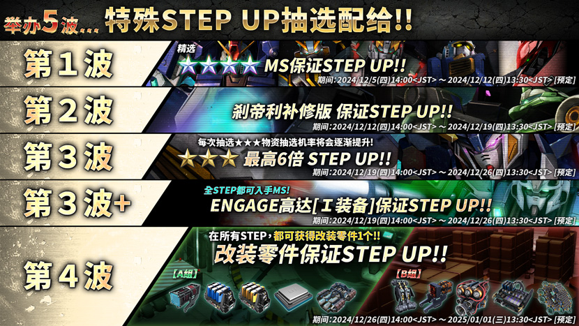 - 在最终STEP保证可从精选★★★★MS中,获得1架的STEP UP抽选配给。