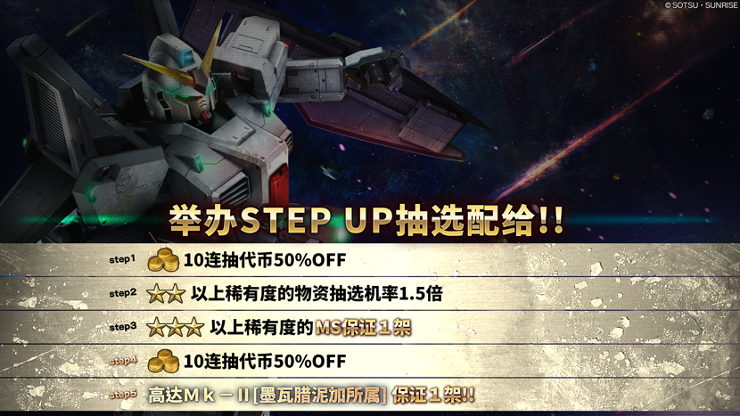 - 2025年1月9日(周四)起,举办保证获得高达Mk-Ⅱ[墨瓦腊泥加所属] LV1的STEP UP抽选配给活动。