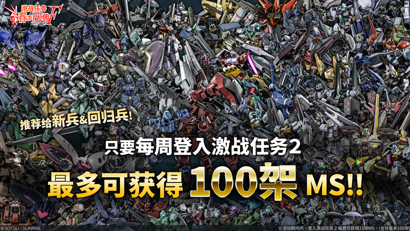 活动期间内,每周登入即可获得最多共100 架MS!! - 活动详情,请参阅这里。