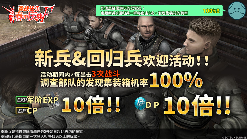 即使是经常游玩的驾驶员,只要跟新兵&回归兵一起出击 ,每出击3次,调查部队的集装箱发现率也将增为100%UP! - 活动详情,请参阅这里。