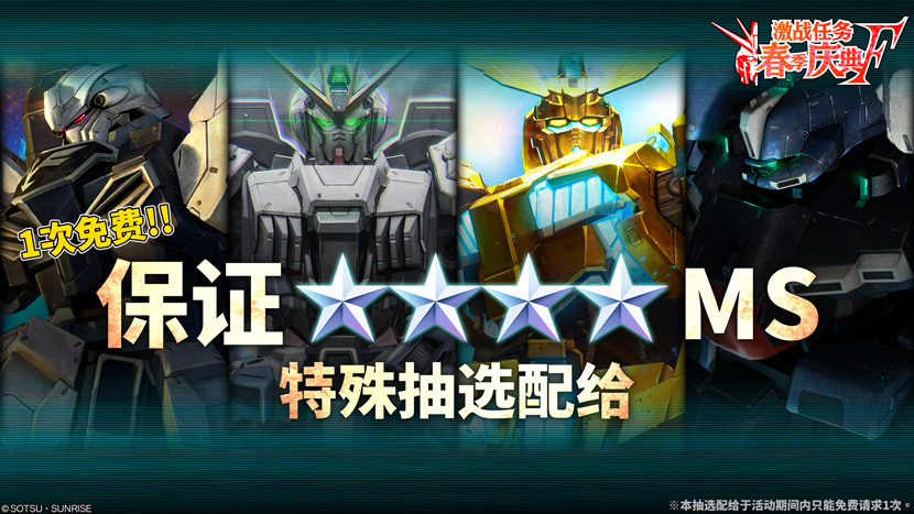 - 将实施免费进行1次,保证从★★★★MS中随机获得其中1架的特殊抽选配给!