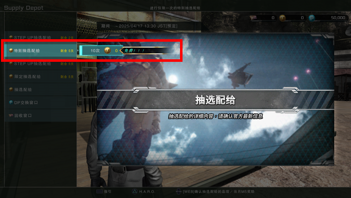 - 请于物资配给局中确认,如下图红框所示的「特别抽选配给」即为本次活动对象。