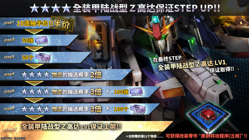 - 2025年5月29日(周四)起,举办保证获得全装甲陆战型Z高达 LV1 的STEP UP抽选配给活动。