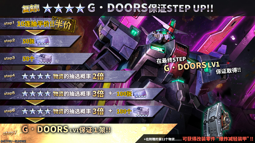- ・STEP6(代币30枚):★★★★物资的抽选机率3倍!+ 保证获得改装套件[★★★★]100个!