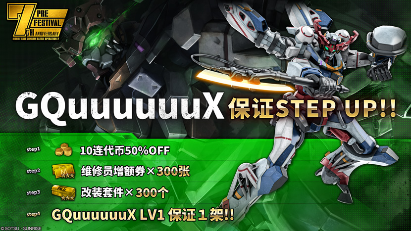 - 举办可获得新MS「GQuuuuuuX LV1」及★★★强化物资的STEP UP抽选配给!