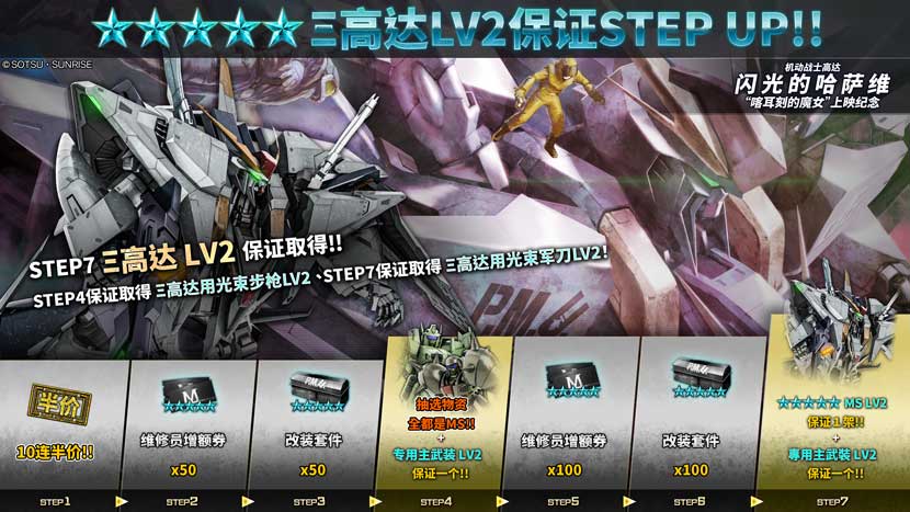 - ・STEP7(代币30枚):「Ξ高达 LV2」保证1架!!
