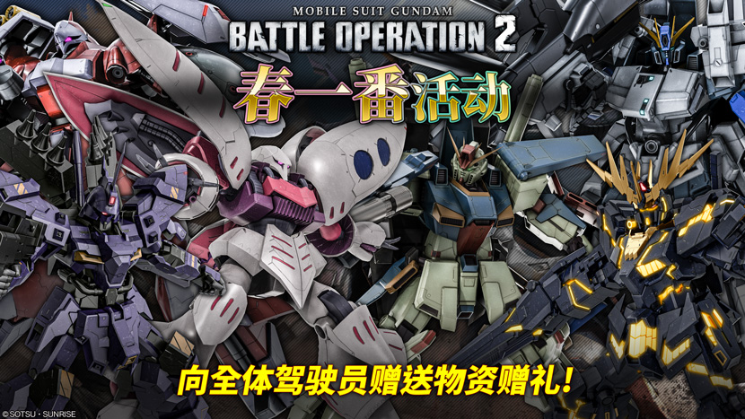 - 活动期间内,只要登入激战任务2,即可获得「ZZ高达 LV3」及「报丧女妖 LV2」等可出击COST750的MS与武器 作为赠礼!