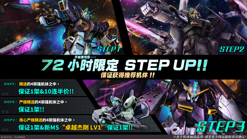 完成STEP3后,STEP UP抽选配给便结束。 - ・STEP1(代币15枚):精选的4架强势机体中保证获得1架&代币50%OFF!