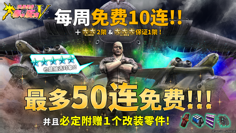 (最多50连抽 +★★以上MS保证10架&★★★以上MS保证5架) - 此外!保证再从4个改装零件改装零件中随机获得1个!