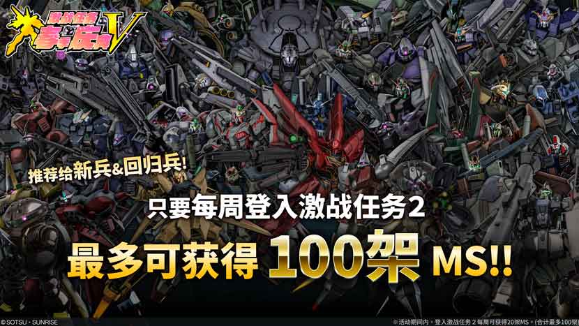 活动期间内,每周登入即可获得最多共100 架MS!! - 活动详情,请参阅这里。