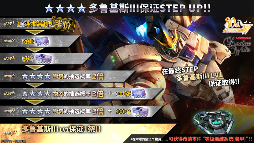 - ・STEP6(代币30枚):★★★★物资的抽选机率3倍!+ 保证获得改装套件[★★★★]100个!