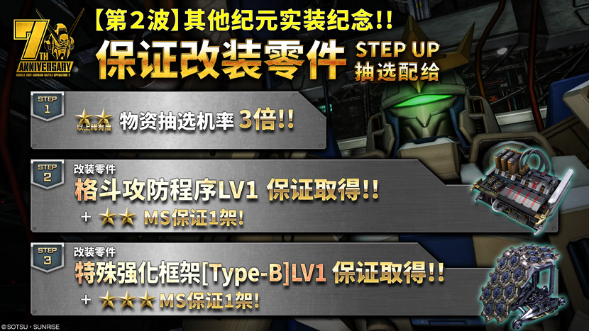 - ・STEP3(代币30枚):保证特赠改装零件「特殊强化框架[Type-B] LV1」!&保证★★★MS1架!