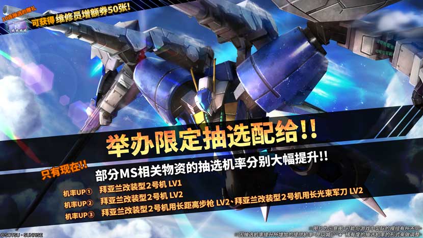 限定抽选配给中,将会提高「拜亚兰改装型2号机」相关品项抽选机率。 - 此外,在本限定抽选配给进行10连抽,保证附赠「维修员增额券[★★★★]」50张。