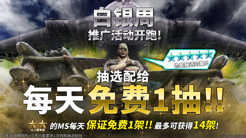 - 期间内,有机会获得至今为止在 抽选配给中登场过之所有MS的特别抽选配给(1次),每天可免费进行1次。