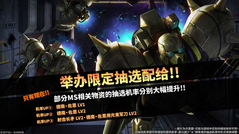 - 限定抽选配给将会针对目标机体各LV,主武装等提高各自的抽选机率。