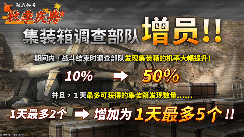 - 活动期间内,平时战斗结束后的集装箱发现率为「10%」,此次则增为「50%」!