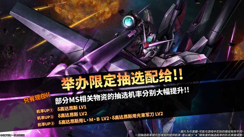 - 限定抽选配给将会针对目标机体各LV,主武装等提高各自的抽选机率。