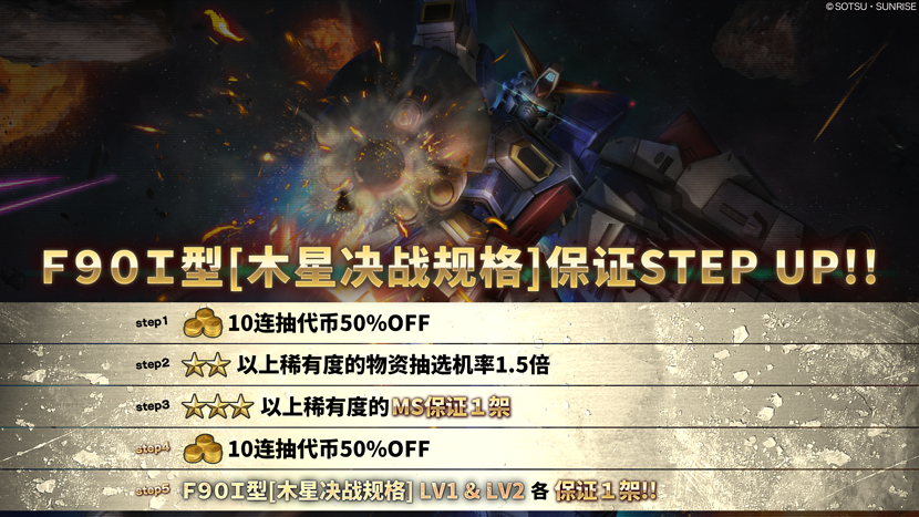 - 2025年12月11日(周四)起,举办保证获得 F90I型[木星决战规格]LV1&LV2的STEP UP抽选配给 。