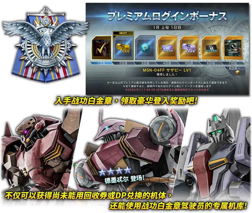 - ※获领「战功白金章」的隔天5:00AM<JST>之后,才能获得豪华登入奖励。