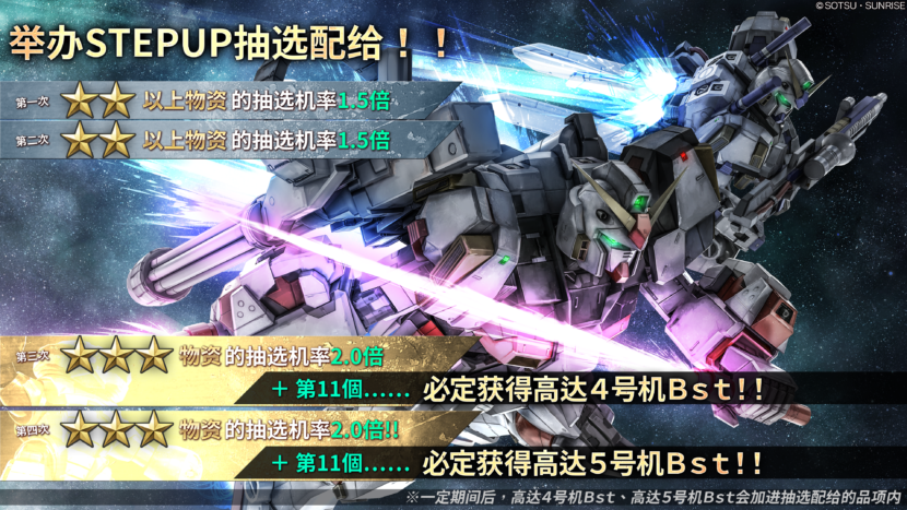 ・STEP4(代币30枚):★★★的物资抽中机率提升2倍!&保证抽中先行投入的 「高达5号机Bst」!