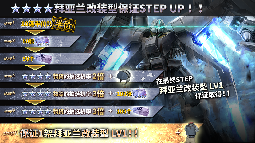 - ・STEP5(代币30枚):★★★★的物资抽中机率提升3倍!+ 特别赠送整备士增额券[★★★★]100张!