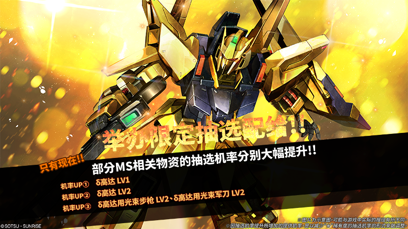 限定抽选配给中将会提高「δ高达」相关品项抽选确率。 - ■抽中机率提升的物资