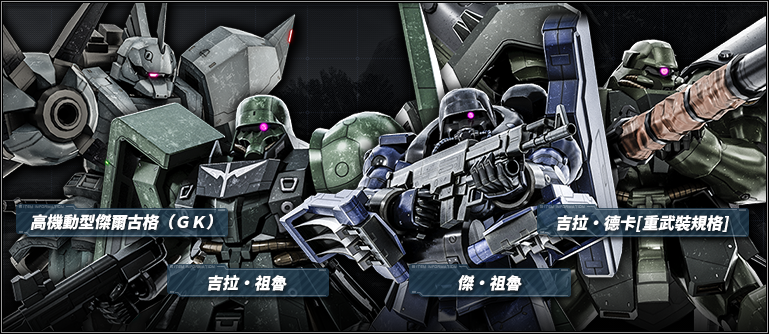 ・★★ 吉拉・祖魯 LV3 (泛用機、地上/宇宙兩用機體、成本值650) ・★★ 吉拉・德卡[重武裝規格] LV3 (支援機、地上/宇宙兩用機體、成本值650) ・★★ 傑・祖魯 LV3 (突擊機、地上専用機體、成本值650) ・★★ 高機動型傑爾古格(GK) LV2 (突擊機、地上/宇宙兩用機體、成本值550)