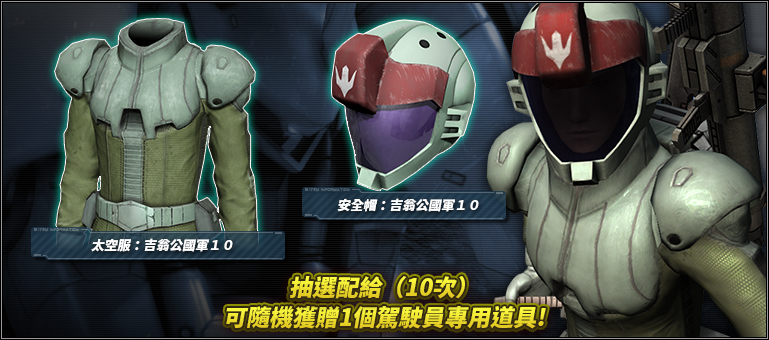 - ※期間內只要進行抽選配給(10次)就會自動進行第11次的抽選配給,就可隨機獲得駕駛員專用道具1個。