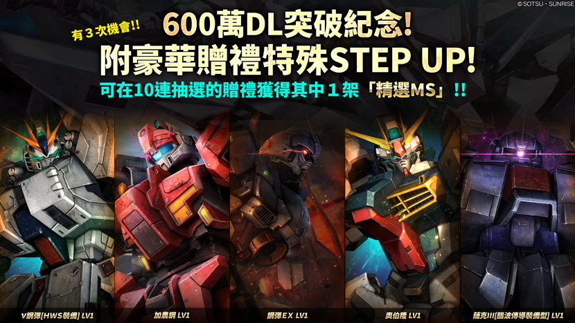 完成STEP3時,STEP UP抽選配給將會結束。 - ・STEP1(代幣30枚):10連抽 +保證從精選MS中獲得1架!