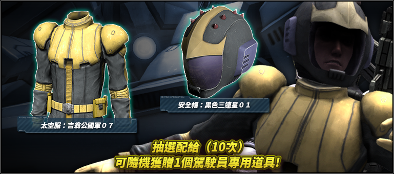 - ※期間內只要進行抽選配給(10次)就會自動進行第11次的抽選配給,就可隨機獲得駕駛員專用道具1個。