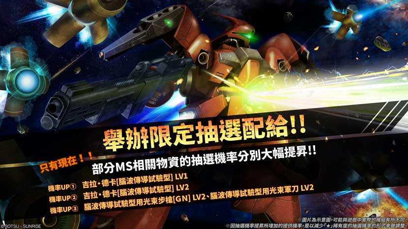 2025.04.10 應用程式資料更新公告 ■2025/04/10 14:00 ver.0193.2118 ■抽選配給品項更新公告 ※關於更新的品項詳情,請參閱這裡。 ■舉辦限定抽選配給公告 ※限定抽選配給詳情,請參閱這裡。 ■COST750保證STEP UP抽選配給公告 ※STEP UP抽選配給詳情,請參閱這裡。 ■回收窗口已追加可交換物資。 ⇒ 部分追加物資介紹 ■機體 ・追加★★★妖精鋼彈(LA) LV2 ・追加★★★提泰妮亞 LV2 ・追加★★伊弗利特・獵裝型 LV2 ・追加★★薩克Ⅱ[狙擊型](HH) LV2 ・追加★★薩克半加農(MB) LV2 ・追加★★吉姆・斯巴達(RG) LV2 ・追加★★陸戰高機動型薩克(AS) LV2 ■主武裝 ・追加★★★伊弗利特・獵裝型用狙擊步槍 LV2 ※2025年4月10日(週四) ~ 4月11日(週五) 的2天期間,上述物資保證會陳列於回收窗口。 ■DP交換窗口已追加可交換物資。 ⇒ 部分追加物資介紹 ■機體 ・追加★★吉姆・斯巴達[BD隊規格] LV1~2 ■已從抽選配給的品項中排除部分物資。 ※詳情請參閱這裡。 ■遊戲模式 分級戰/快速戰出擊相關更新。 ※隨著上述提及的更新,遊戲中顯示「下次刷新時可排隊參戰的遊戲模式」可能會與更新前所顯示的畫面有所不同。 ■情境戰鬥更新。 ⇒ 本次舉辦的情境為「虹色的啟程」。 ※情境戰鬥的舉辦時程等詳情,請參閱這裡。 ■本週的週末限定戰時程 週末限定戰時程 特殊規則 2025年4月11日(五) 4:00<JST> ~ 4月14日(一) 3:59<JST> 「混成編組」「簡易戰鬥」「隨機目標」 「亂鬥戰」「決鬥戰」每2小時輪流舉辦 舉辦情境戰鬥「虹色的啟程」 ※情境戰鬥詳情,請參閱這裡 ■下一次軍團戰時程 關於下一次軍團戰的舉辦期間及報酬領取時間,請參閱這裡。 關於軍團戰的概要,請參閱這裡。 應用程式資料的更新方法,請參閱這裡。