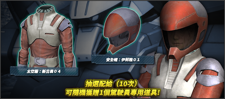 - ※期間內只要進行抽選配給(10次)就會自動進行第11次的抽選配給,就可隨機獲得駕駛員專用道具1個。