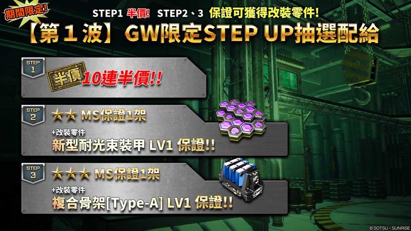 - ・STEP2(代幣30枚):特贈改裝零件「新型耐光束裝甲 LV1」!&★★MS保證1架!