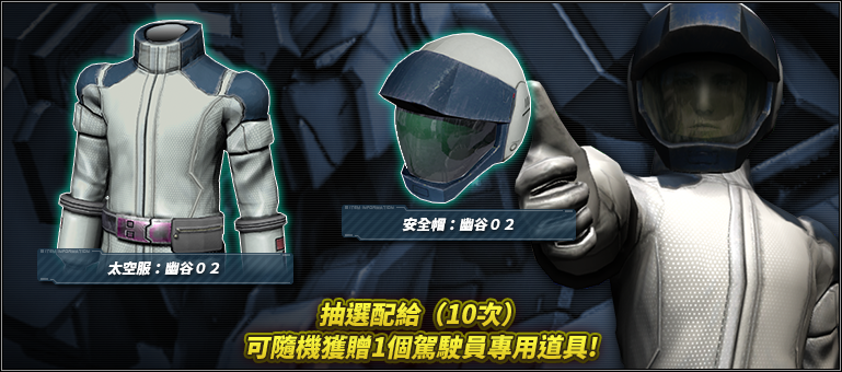 - ※期間內只要進行抽選配給(10次)就會自動進行第11次的抽選配給,就可隨機獲得駕駛員專用道具1個。