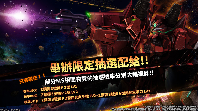 限定抽選配給中將會提高「Z鋼彈3號機P2型」相關品項抽選機率。 - ■抽中機率提昇的物資