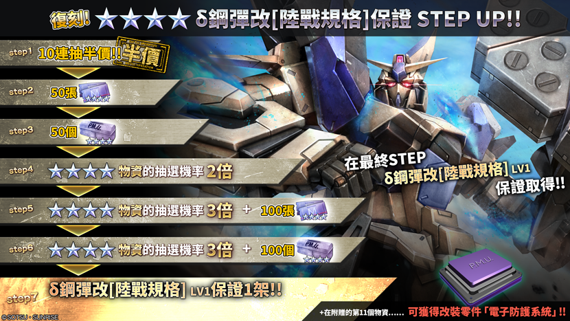 - ・STEP7(代幣30枚):「δ鋼彈改[陸戰規格]LV1」保證1架!!