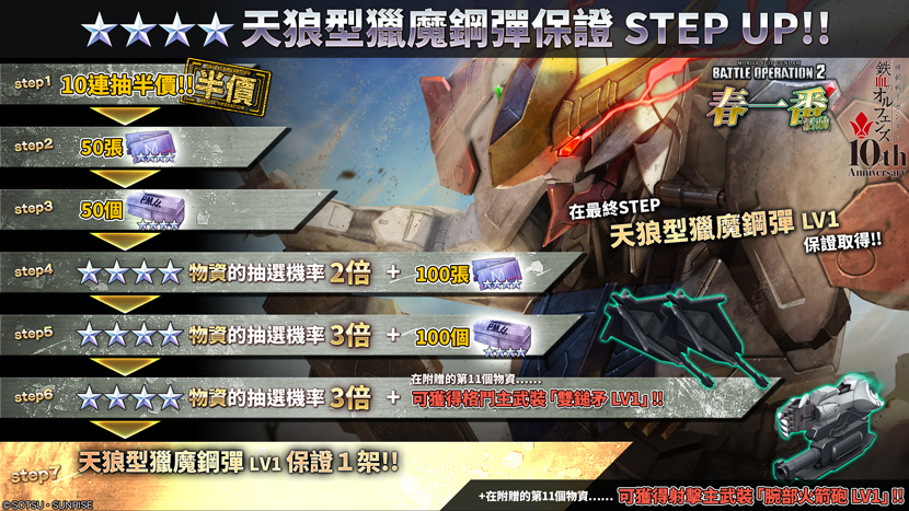 - 2026年3月5日(週四)起,將舉辦保證獲得天狼型獵魔鋼彈的 STEP UP 抽選配給,