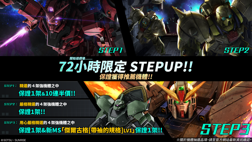 完成STEP3時,STEP UP抽選配給將會結束。 - ・STEP1(代幣15枚):精選的4架強機體之中保證1架&代幣50%OFF!