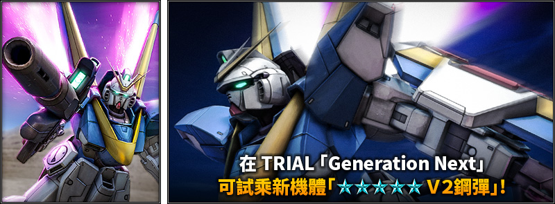 - ⇒ 除了可在TRIAL「Generation Next」試乘新機體「V2鋼彈」以外,還可在BOSS「反叛的代價」與腦波傳導型鋼彈Mk-Ⅱ 及 昆曼沙(AR)挑戰連戰。