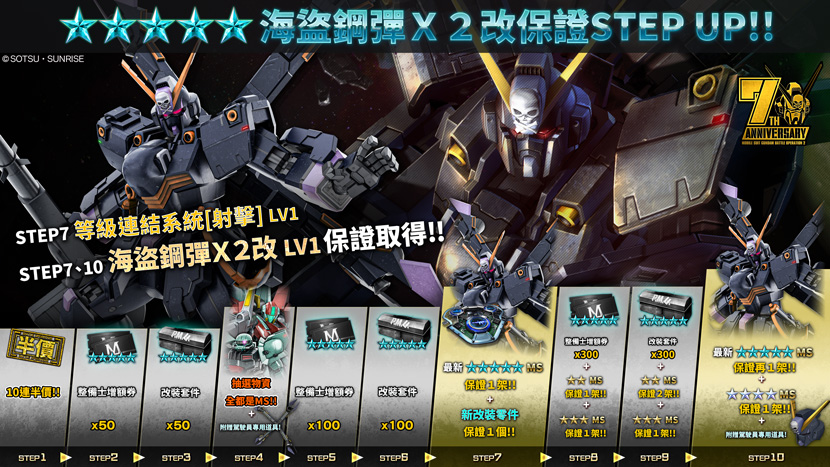 - ・STEP7(代幣30枚):「海盜鋼彈X2改 LV1」保證1架!!