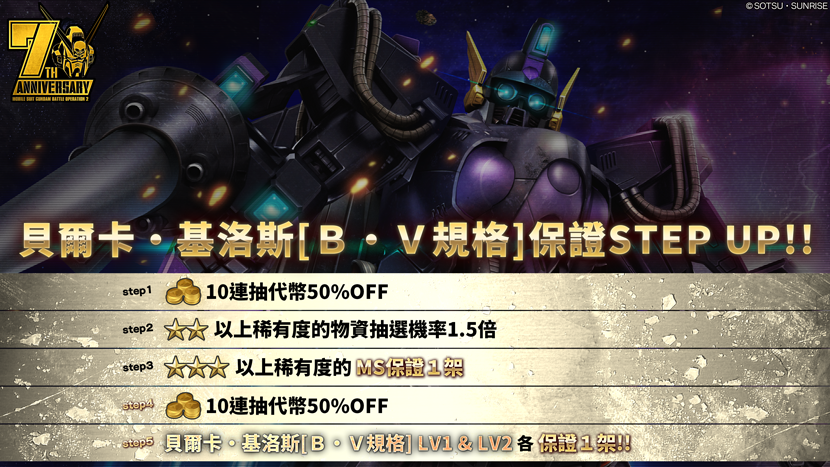 - ・STEP5(代幣30枚):貝爾卡・基洛斯[B・V規格]LV1&LV2各保證1架!