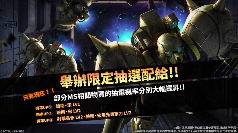 - 限定抽選配給將會針對目標機體各LV,主武裝等提高各自的抽選機率。