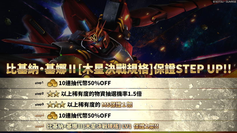 - ・STEP5(代幣30枚):比基納・基娜Ⅱ[木星決戰規格]LV1保證1架!