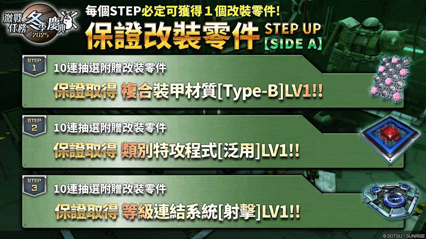 完成STEP3時,STEP UP抽選配給將會結束。 - ・STEP1(代幣30枚):在10連抽選的附贈改裝零件,保證獲得「複合裝甲材質[Type-B]LV1」!