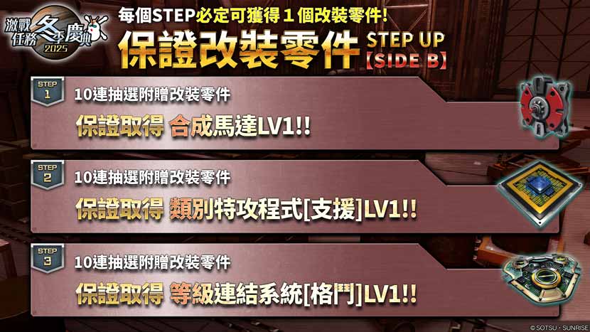 ・STEP2(代幣30枚):在10連抽選的附贈改裝零件,保證獲得「類別特攻程式[支援]LV1」!